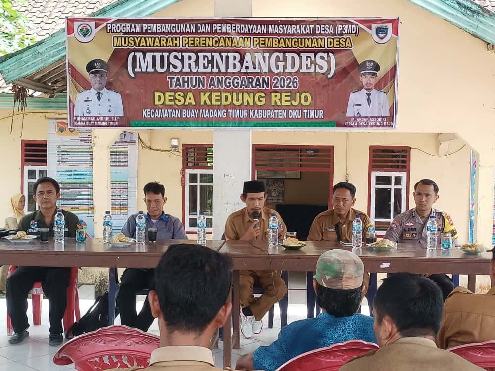 OKU Timur – Sidikbangsa. Com – Dalam upaya memperkuat sinergi antara kepolisian dan pemerintah desa, Bhabinkamtibmas Desa Kedung Rejo, Kecamatan Buay Madang Timur, Brigadir Asep Dwi Pramono, S.E., menghadiri kegiatan Musyawarah Perencanaan Pembangunan Desa (Musrenbangdes) yang membahas Rencana Kerja Pemerintah Desa (RKPDES) serta usulan prioritas untuk tahun anggaran 2026.