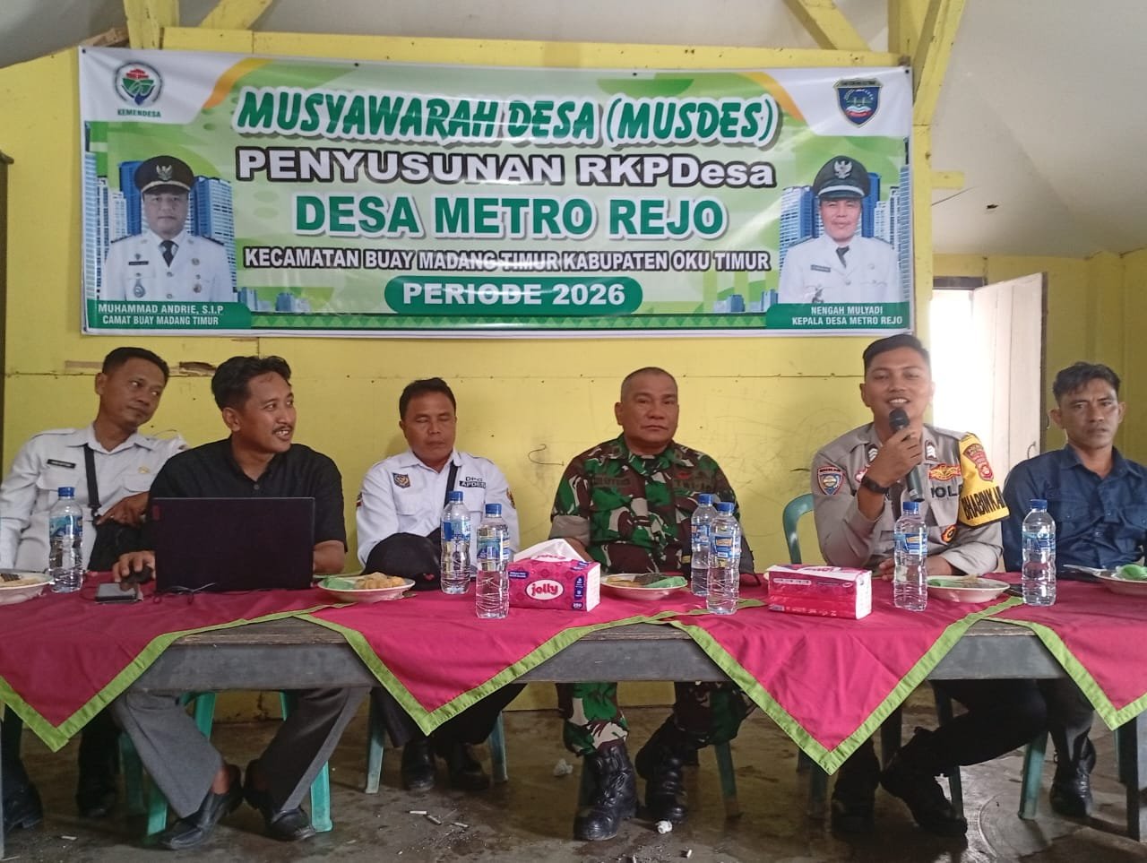 Musdes dimulai sekitar pukul 10.00 WIB dan dihadiri oleh sejumlah unsur pemerintahan dan masyarakat. Hadir dalam kegiatan tersebut antara lain Pendamping Desa Kecamatan Buay Madang Timur, Zaenal selaku perwakilan Camat, Kepala Desa Metro Rejo Nengah Mulyadi, Kapolsek Buay Madang Timur IPTU Swisspo, S.H., M.H., yang diwakili oleh Bhabinkamtibmas Brigpol Iswanto, S.H., serta Bhabinsa Peltu Rusdi mewakili Danramil Buay Madang.