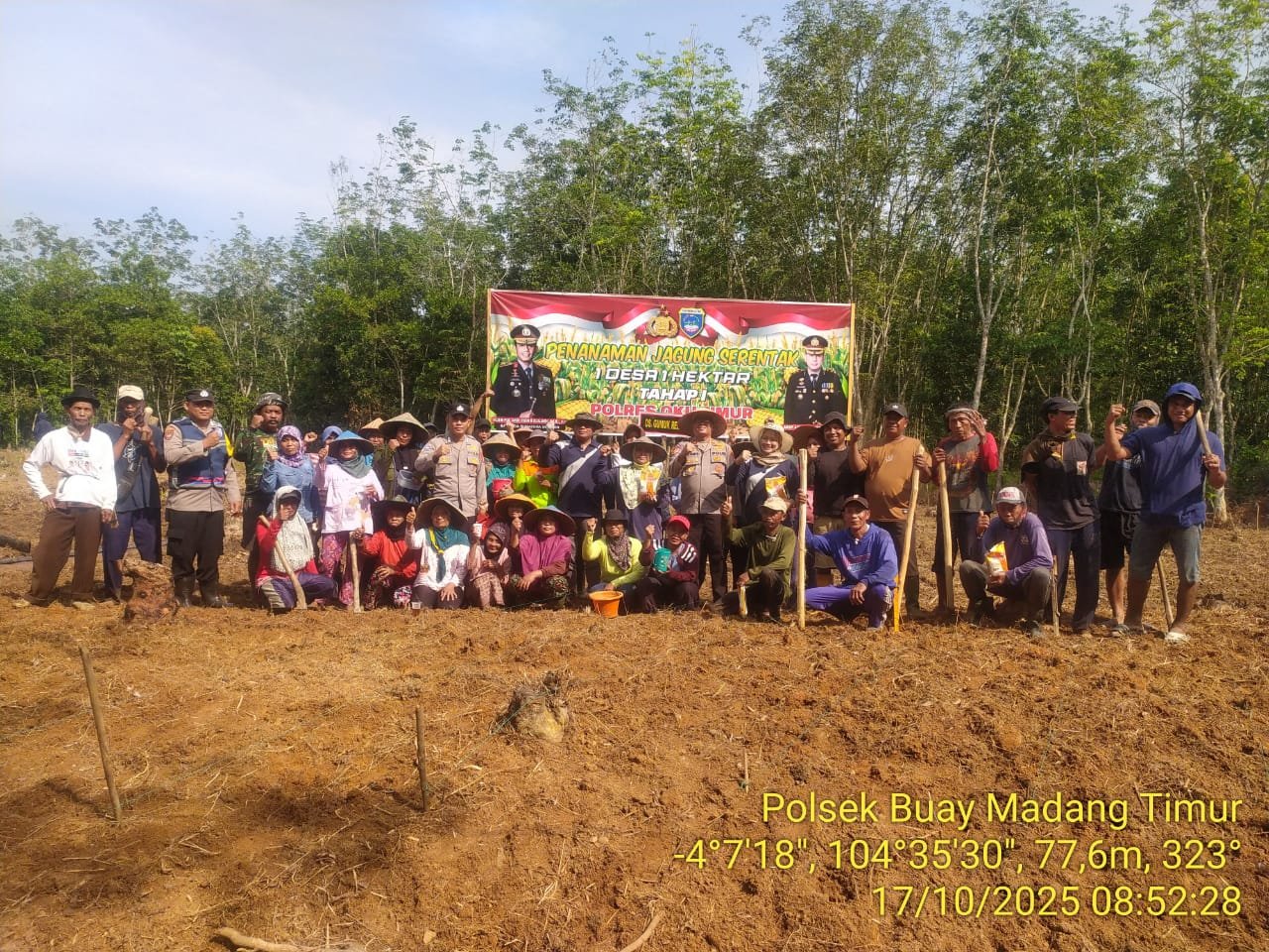 OKU Timur – Sidikbangsa. Com – Kepolisian Sektor (Polsek) Buay Madang Timur terus menunjukkan komitmennya dalam mendukung program pemerintah di bidang ketahanan pangan nasional. Hal ini dibuktikan melalui kegiatan penanaman jagung di Desa Gumuk Rejo, Kecamatan Buay Madang Timur, Kabupaten OKU Timur, pada Jumat (17/10/2025).