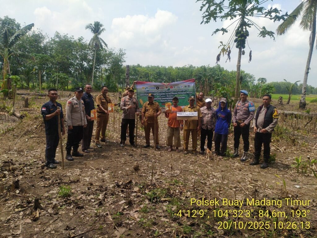 OKU Timur – Sidikbangsa. Com – Sebagai wujud dukungan terhadap program ketahanan pangan nasional, jajaran Polsek Buay Madang Timur, Polres OKU Timur, Polda Sumatera Selatan, melaksanakan kegiatan Tanam Jagung 1 Desa 1 Hektar di Desa Tanjung Sari, Kecamatan Buay Madang Timur, Senin (20/10/2025).