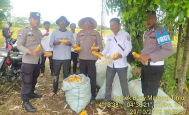 Kegiatan ini dipimpin langsung oleh Kapolsek Buay Madang Timur IPTU Swisspo, S.H., M.H., dan dihadiri oleh Ps. Kanit Binmas Bripka Ari Wicaksono, Ps. Kanit Provost Bripka Didi Handoko, Bhabinkamtibmas Brigadir Rusendi Ardianto, Sekretaris Desa Berasan Mulya, perangkat desa, serta para petani jagung setempat.