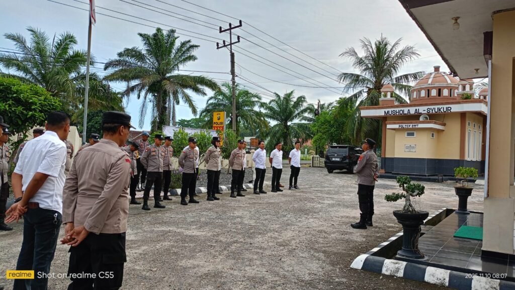 OKU Timur — Sidikbangsa.Com – Polsek Buay Madang Timur, Kabupaten OKU Timur, menggelar apel pagi pada Kamis (10/11/2025) pukul 07.30 WIB sebagai bagian dari upaya memperkuat soliditas dan profesionalitas personel dalam menjaga keamanan wilayah. Apel dipimpin langsung Kapolsek Buay Madang Timur, Iptu Swisspo, SH, MH, dan diikuti seluruh personel yang hadir lengkap sebanyak 27 anggota.