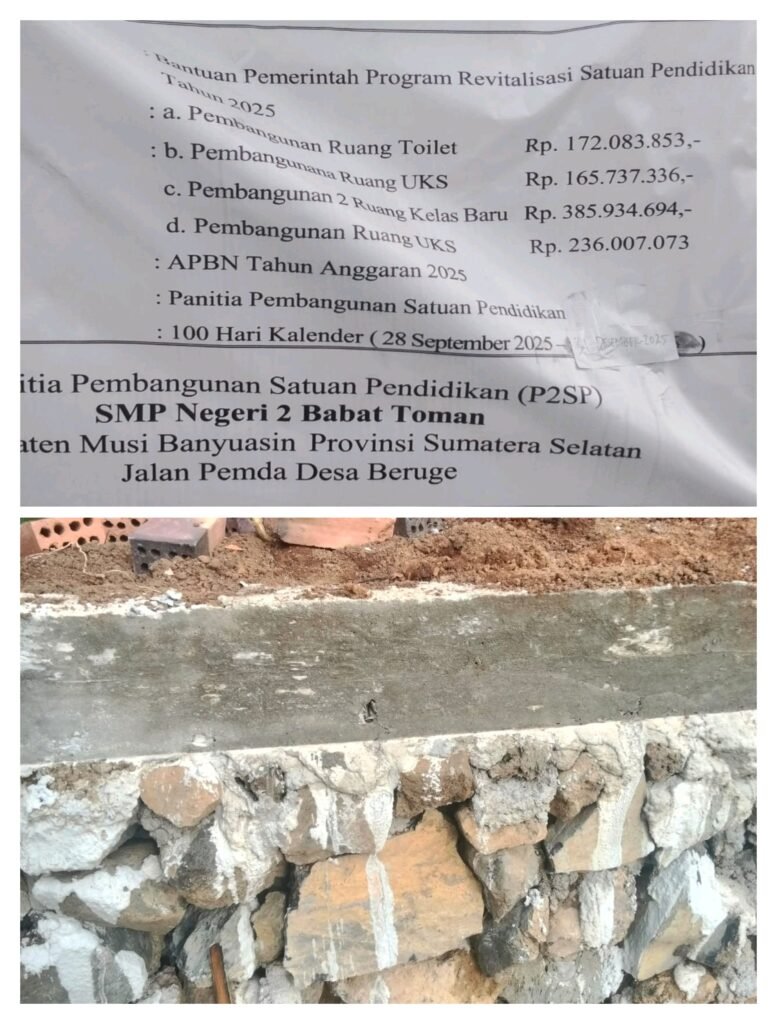 Musi Banyuasin –Sidikbangsa.com – Pekerjaan revitalisasi sarana pendidikan di SMP Negeri 2 Babat Toman, Kabupaten Musi Banyuasin, Sumatera Selatan, kembali menjadi perhatian serius. Dokumentasi lapangan menunjukkan dugaan kuat bahwa pemasangan pondasi bangunan tidak dilakukan sesuai spesifikasi teknis yang dipersyaratkan.