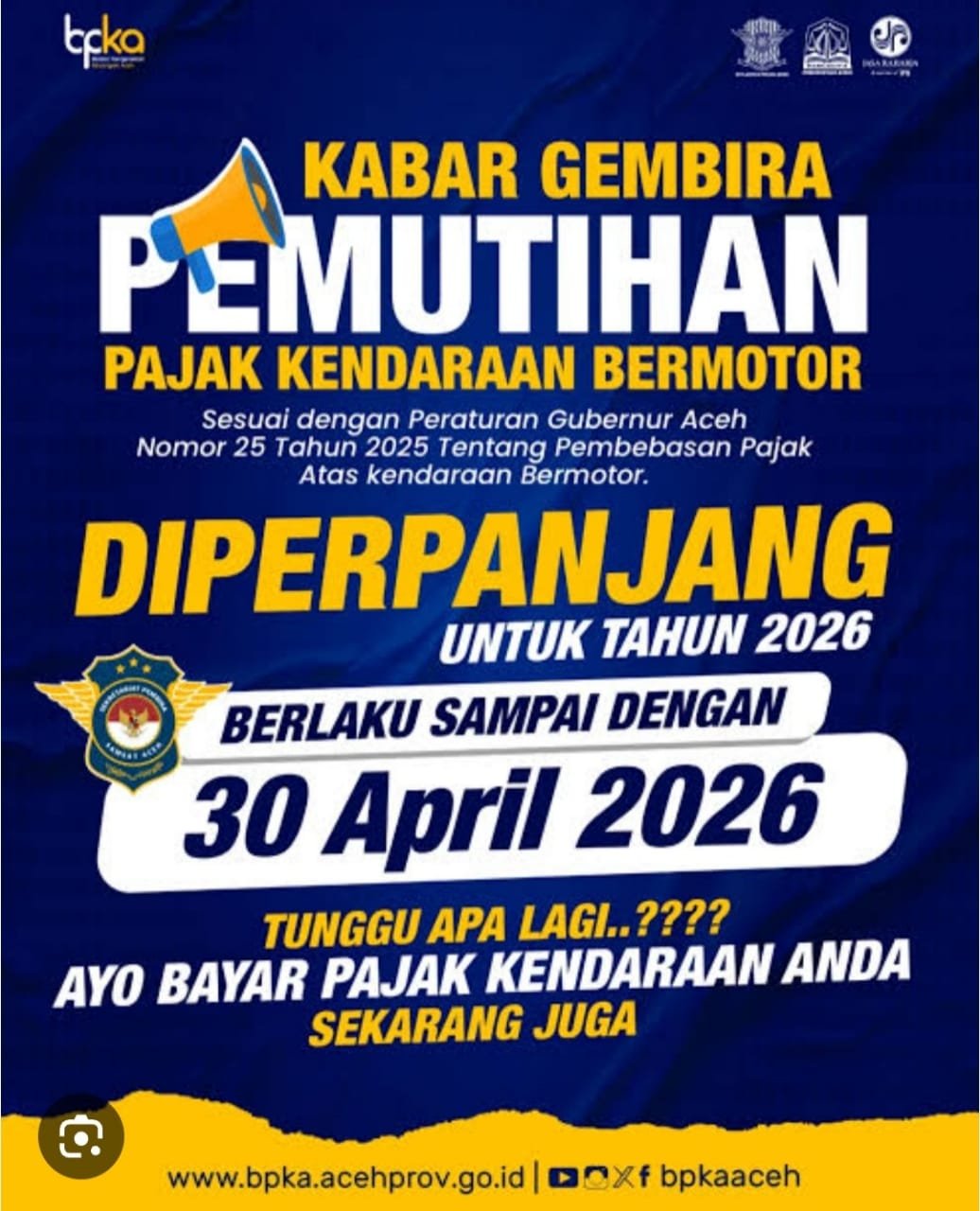 Pemerintah Provinsi Aceh masih memberlakukan program pemutihan pajak kendaraan bermotor yang telah dimulai sejak 2025. Program ini resmi diperpanjang hingga 30 April 2026.