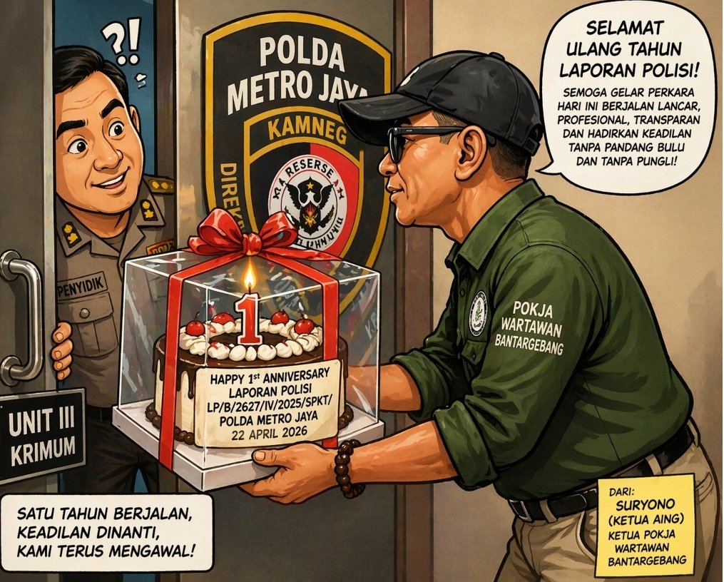 Suryono, yang dikenal dengan sapaan “Ketua Aing” sekaligus Ketua Pokja Wartawan Bantargebang, melontarkan kritik dengan cara tak lazim. Ia “merayakan” satu tahun laporan polisi dengan menghadiahkan kue ulang tahun untuk berkas laporan LP/B/2627/IV/2025/SPKT yang tepat berusia satu tahun pada 22 April 2026.